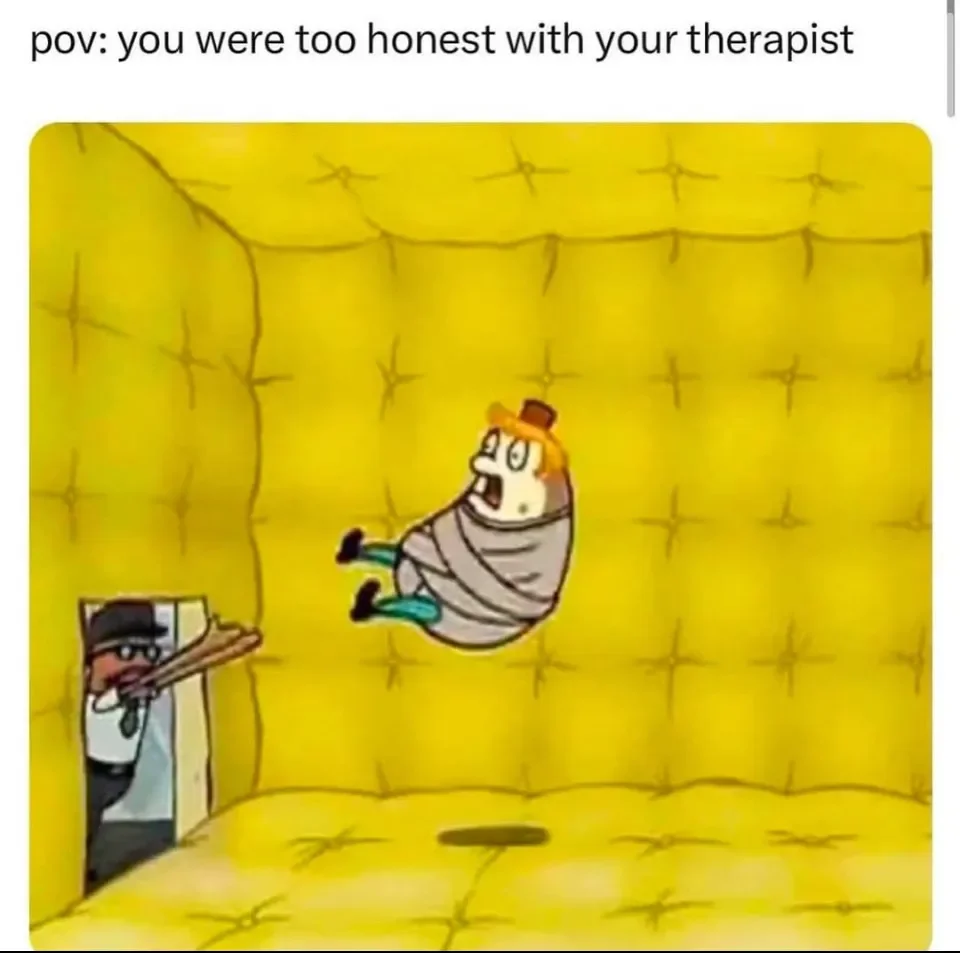 This morning, I saw a meme that I’d seen a thousand iterations of before. It was the “I was too honest with my therapist” format; in this case, the text accompanied by a screenshot from an episode of SpongeBob where a character wearing a straight jacket is thrown into a padded cell.